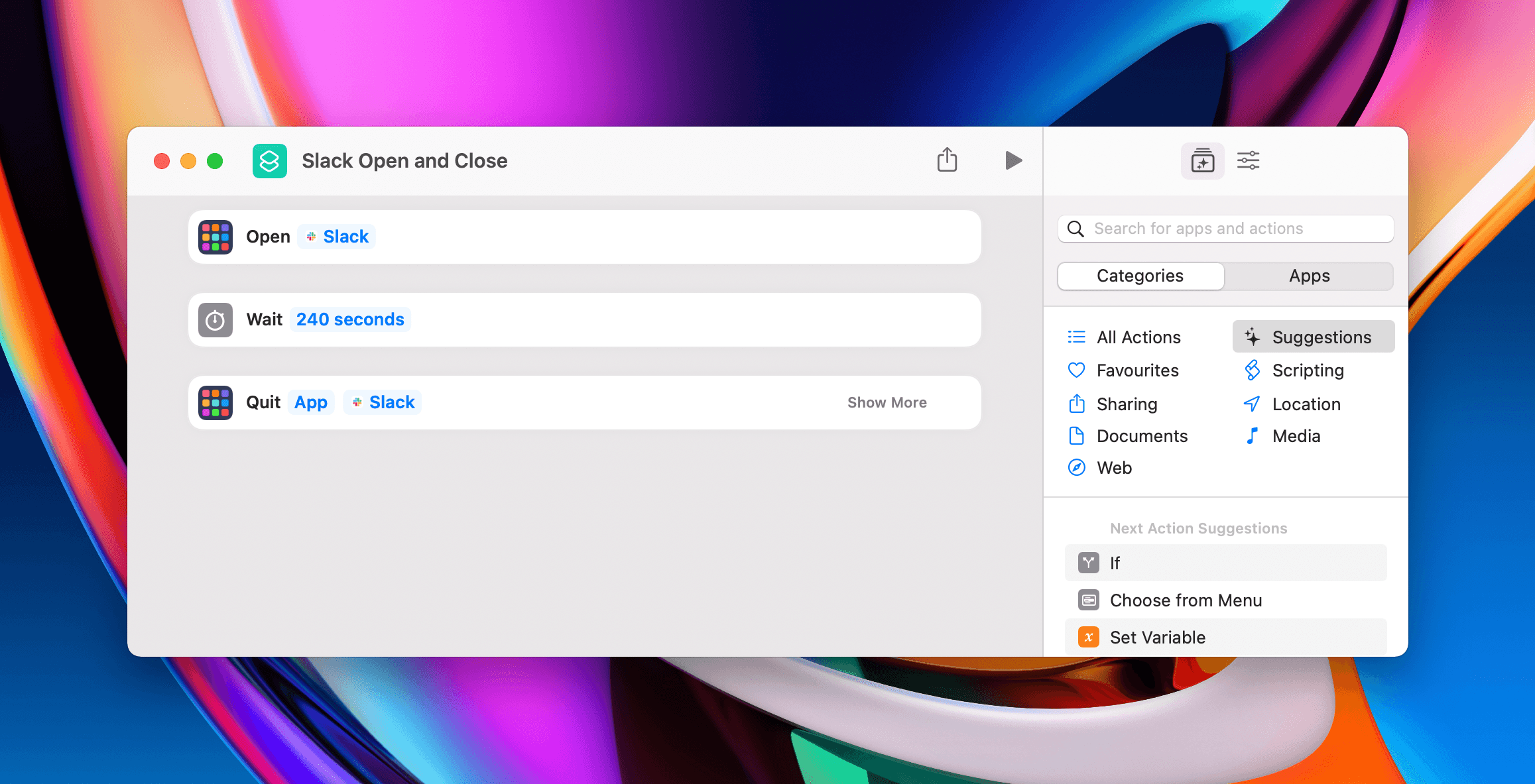 This one I’m quite proud of. I’ve set up an Apple Shortcut so that I can open Slack from Raycast, then automatically close it four minutes later.